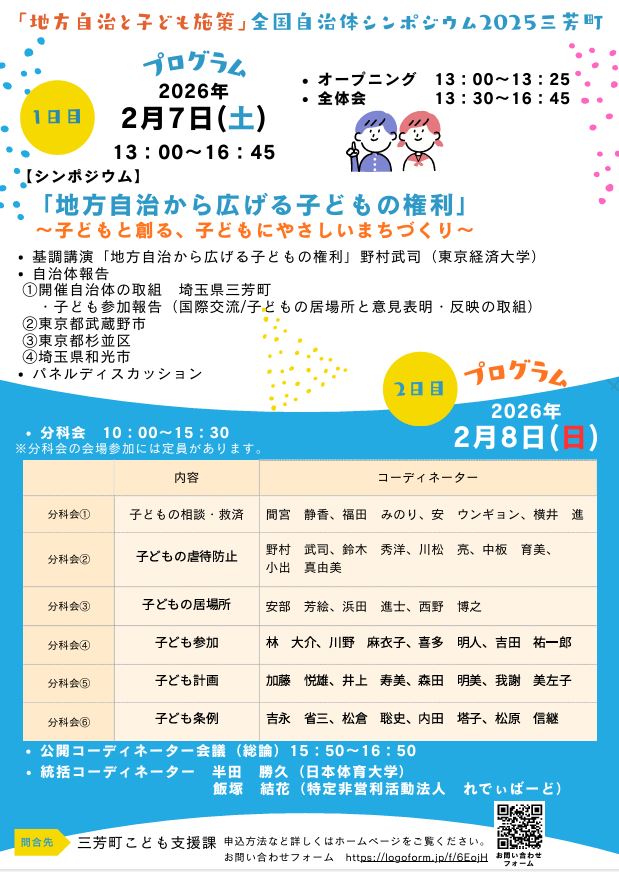 2026年2月7日(土)及び8日(日)の2日間の日程で、「「地方自治と子ども施策」全国自治体シンポジウム2025三芳町実行委員会」と三芳町の主催で