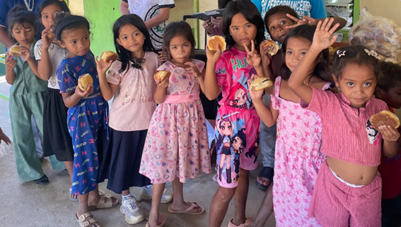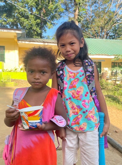 フィリピンの小学校には日本のような調理設備がないため、私たちは栄養価の高いパンやおかゆなど、外部施設で作って簡単に持ち込みのできるものを給食として提供しています。