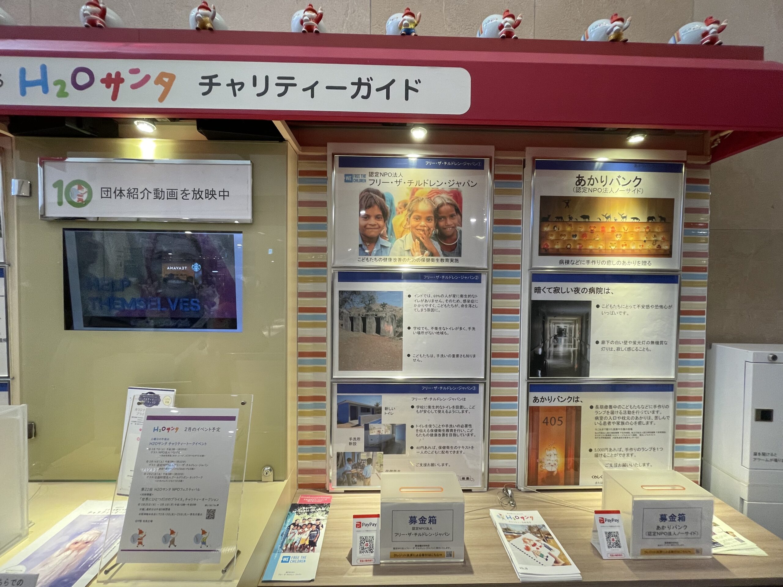「H2Oサンタ」さんの掲示板では、月替わりで団体のパネル展示や募金箱を設置していただいています🎅