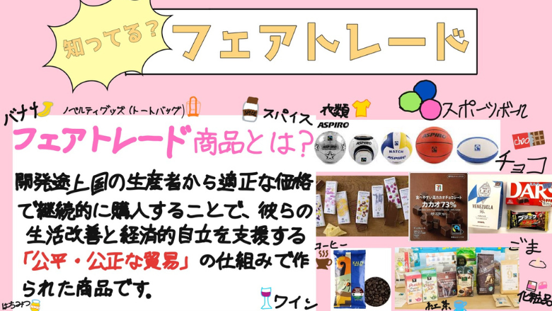 フェアトレードについて詳しく調べ、ポスターを制作し、校内に発信して、フェアトレードを、広めて購入を促した。
